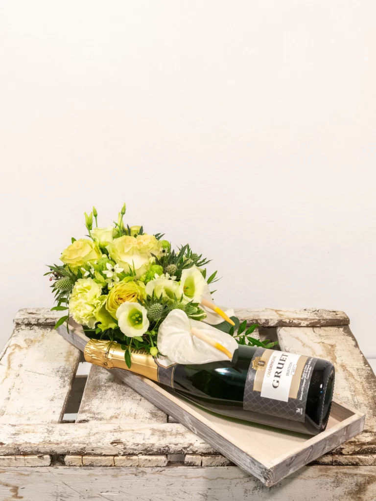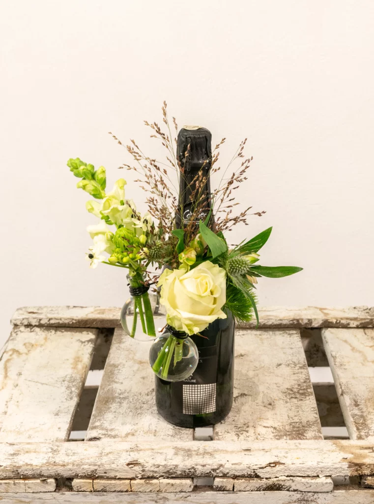 In Bloemenwinkel De Serre kunnen jullie ook terecht voor een leuk, origineel geschenk met een fles wijn, cava of champagne. Wij kleden de fles aan met bloemen of verwerken de fles samen met de bloemen in een glazen of houten schaal,…. Zo is er voor ieder wat wils en naar ieders budget een mogelijkheid.